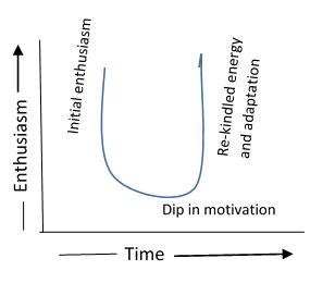 He started the camp with high excitement. The realities of the camp dampened his excitement. Within a day, it had hit rock bottom, when he was ready to quit. Gradually, he re-kindled his enthusiasm; partly through our counseling, but mostly through his own attitude and ability to adjust. He went through the U curve of adaptation. Though he navigated back to top end of U, some of his friends never moved up from the rock bottom. They are the ones who quit the camp.