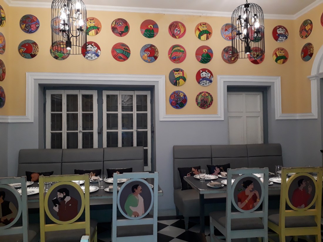 The decor is unique, the chairs and some walls of the old kolkata house are adorned with paintings of Bengali men and women. Some walls have nice terracotta paintings. The chandeliers also gave a different feel.