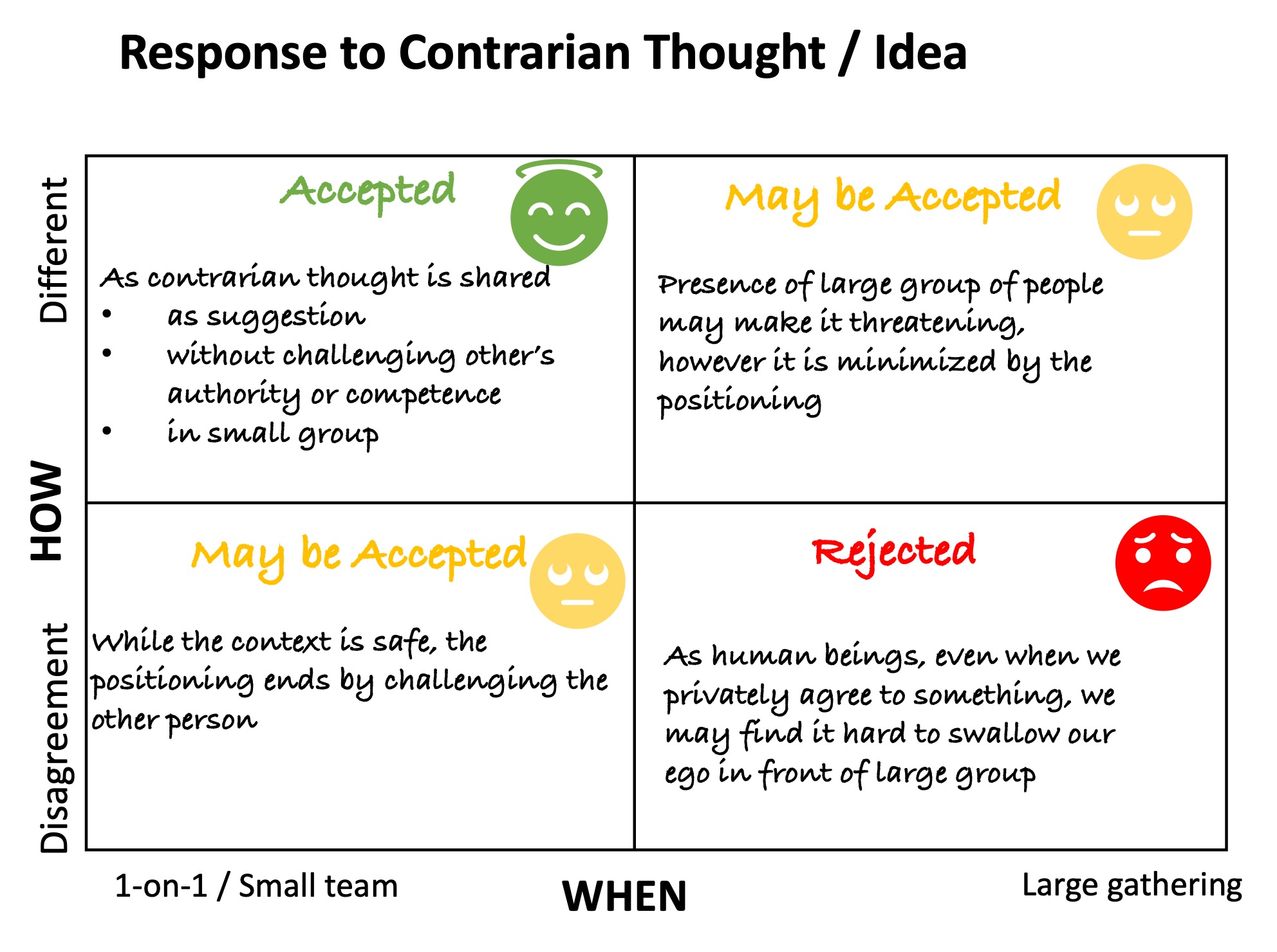 The HOW and WHEN determine the response we get: whether our contrarian idea is accepted or rejected. The two-by-two matrix above outlines the same.