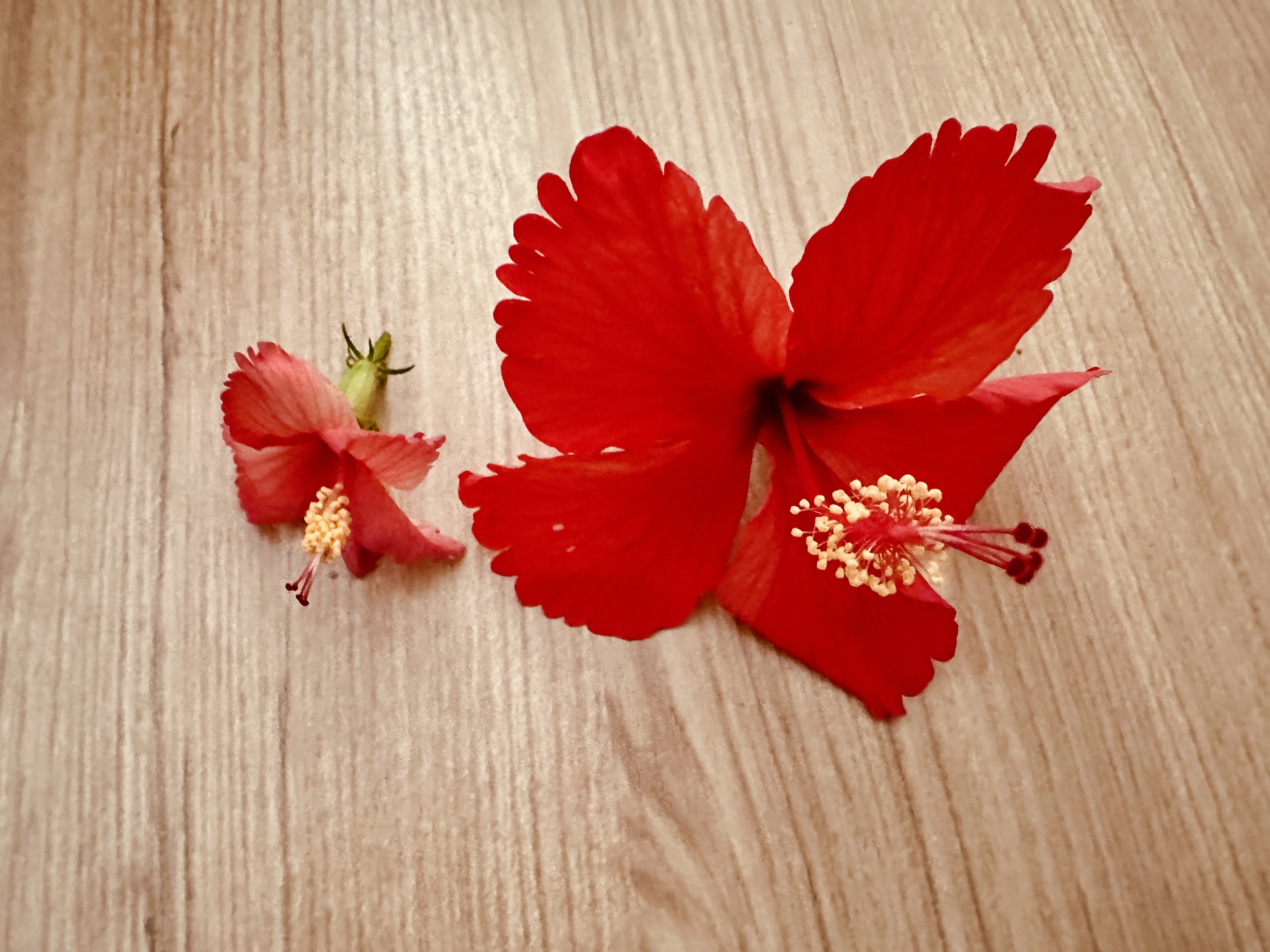 Same garden, same pot, same soil! Yet see the difference in the two hibiscus flowers blooming on the same morning! Not just in size, but in terms of texture of the petals as well.